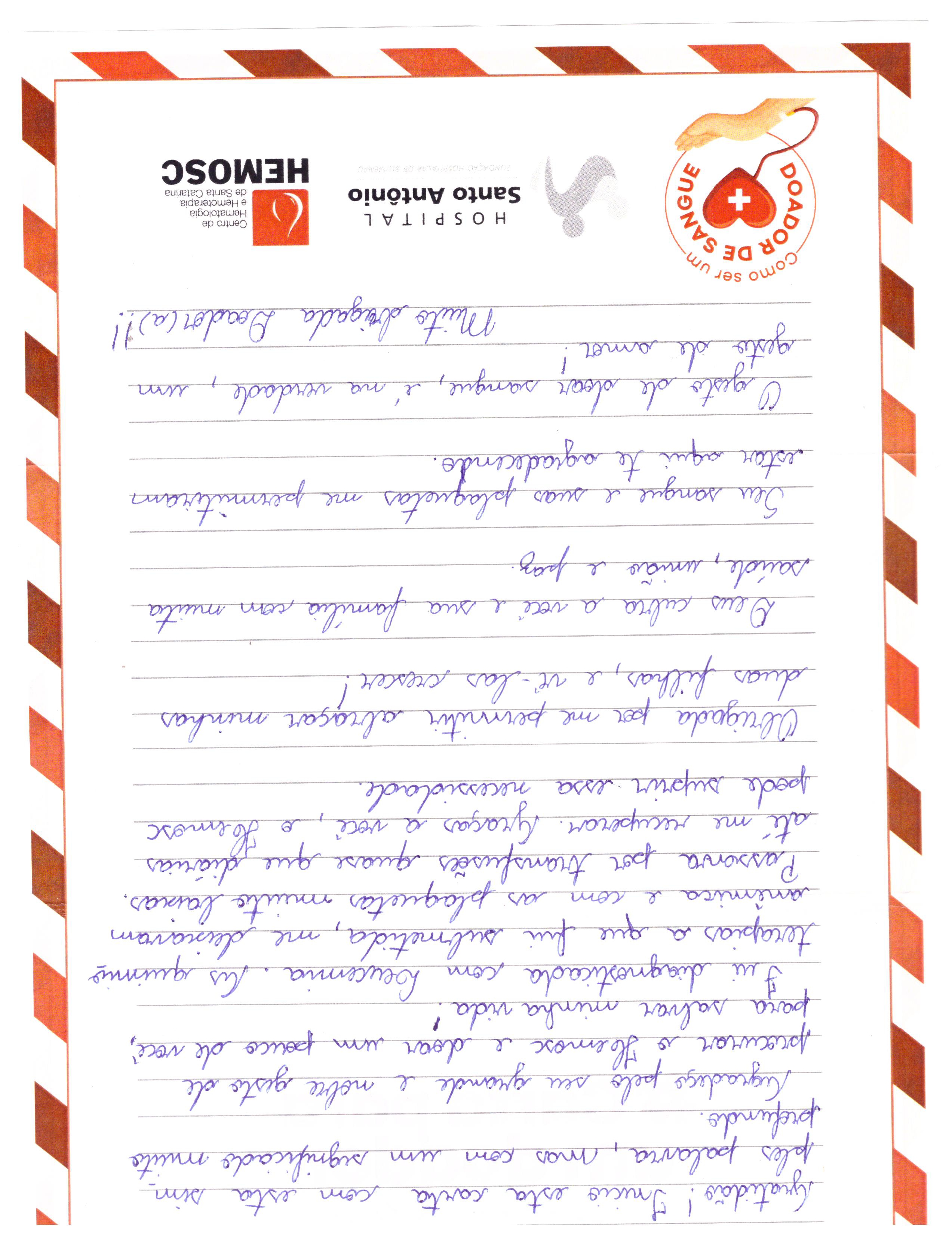 Para Fernanda Lepchack, Gestora da Agência Transfusional do HSA, a ação demonstra o impacto que as doações fazem na vida dos pacientes “esse gesto de tirar um momento do dia, durante a rotina apertada que muitas pessoas têm, é extremamente impactante. Essa bolsa de sangue que vai do HEMOSC para os nossos pacientes, é uma nova chance de tratamento, de melhora e de vida. Os doadores puderam ver pelas mensagens das cartas o quanto esse pequeno gesto muda e salva várias vidas diariamente. O sangue é insubstituível, não pode ser produzido em laboratório, precisamos de pessoas dispostas a doar para termos o estoque para atender quem precisa”, acrescenta.